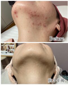 今回は10代から繰り返すニキビで悩みを持っていた40代のあるお客様の1か月後、そして3年後にどのような肌変化が出たかをご紹介させていただきます。
